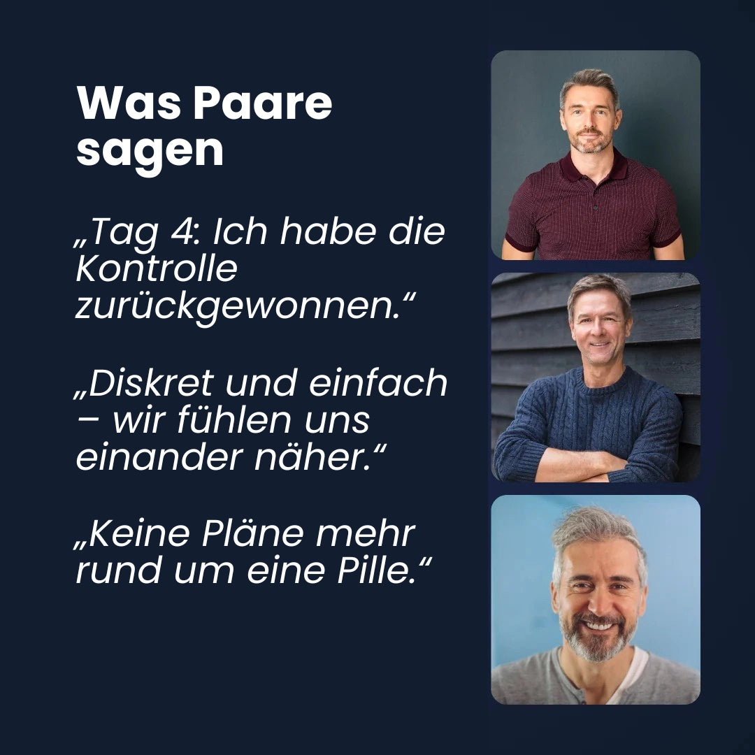 Basierend auf einer Umfrage unter über 1.253 Nutzern: 9 von 10 Männern berichteten nach wenigen Wochen über eine deutliche Verbesserung von Kontrolle und Leistung.